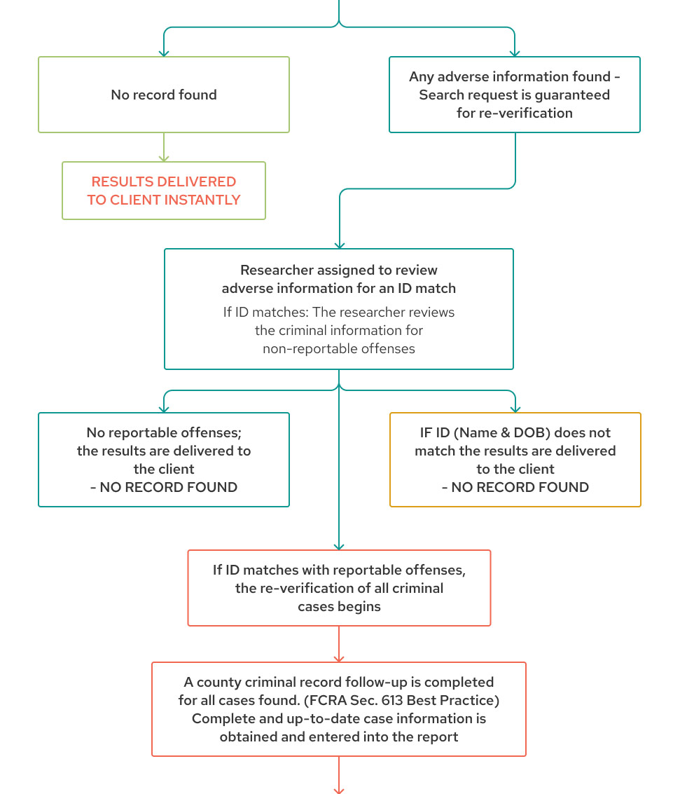 To be proactive, prior to sending national background results to our clients, we verify the accuracy of the information by thoroughly reviewing every record “hit” returned from the national criminal & sex offender database. These records are “frozen” for further investigation at the county or state level. Be wary of any background check service offering you instant results, unless there is a proactive re-verification process as well.