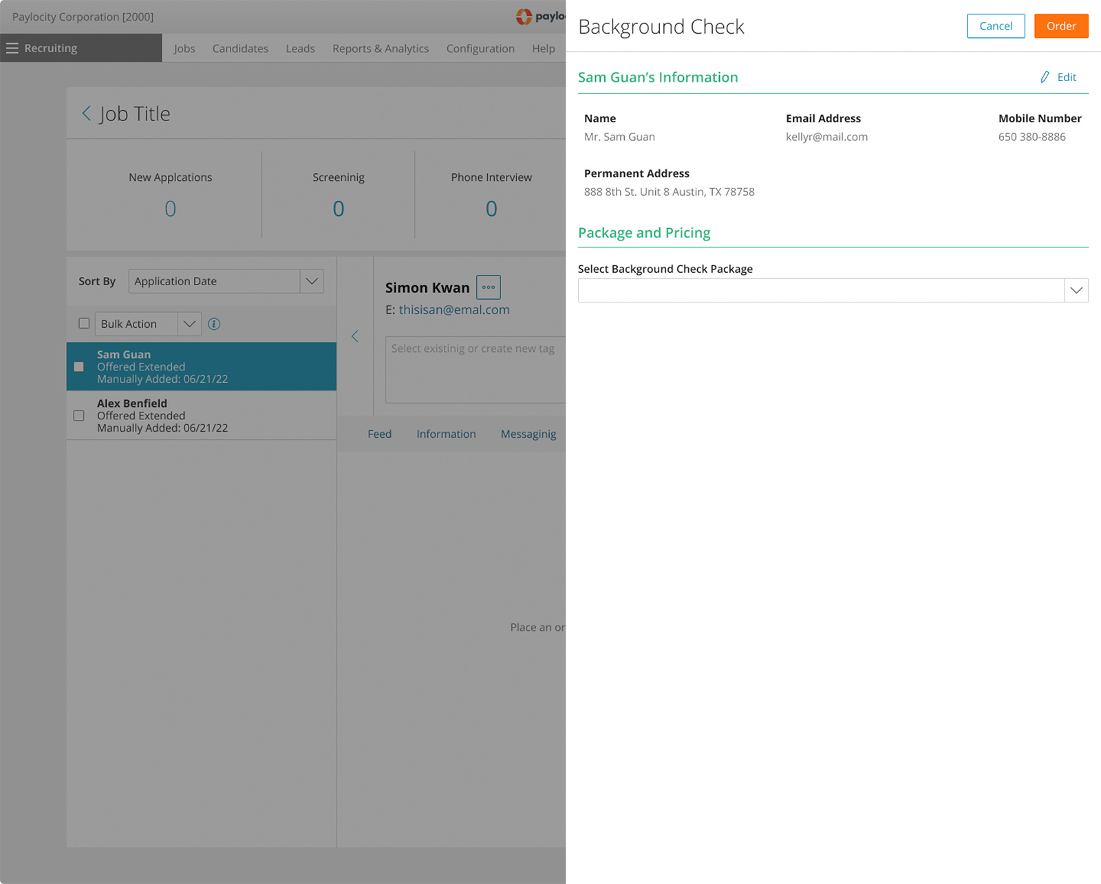 Get started quickly with our self-service onboarding flow. Once credentialed, run background checks directly from Paylocity's recruiting module - reducing manual input and decreasing time to serve.